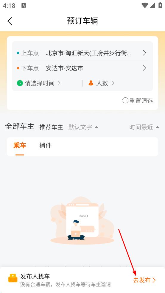 3、若預(yù)訂頁面無合適車輛,點擊底部“去發(fā)布”,發(fā)布找車需求等待車主邀請 。
