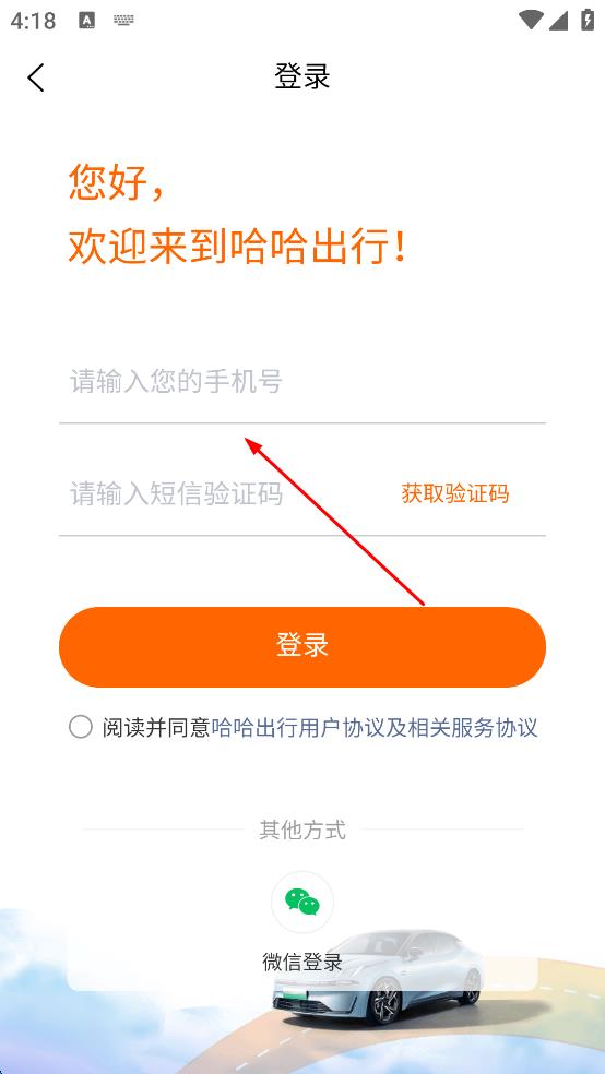 1、打開哈哈出行APP,先完成登錄,輸入手機號和驗證碼,勾選協(xié)議后點擊“登錄”。