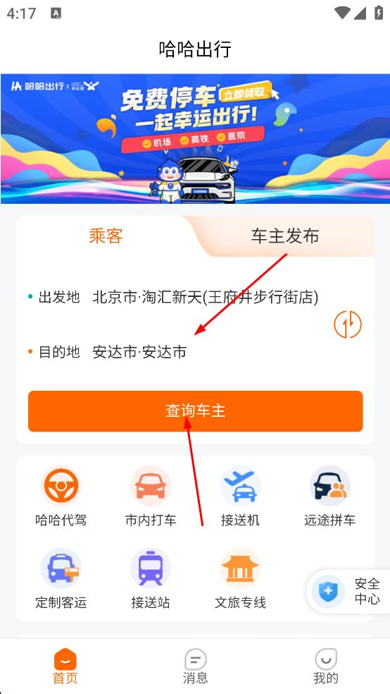 2、登錄后回到首頁,在乘客板塊輸入出發(fā)地和目的地,點擊“查詢車主”進入預(yù)訂頁面。