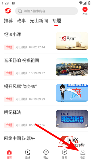 1、在光山融媒的首頁(yè),點(diǎn)擊底部我的,進(jìn)入個(gè)人的頁(yè)面。
