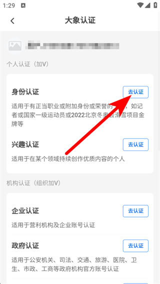 3、在大象認(rèn)證的頁(yè)面,點(diǎn)擊身份認(rèn)證去認(rèn)證,進(jìn)入身份認(rèn)證頁(yè)面。