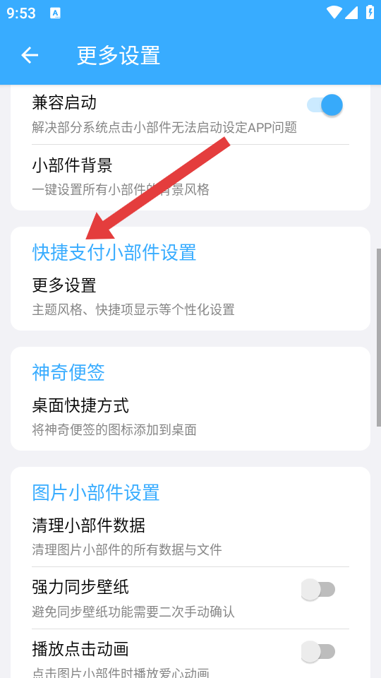 2、在更多設置頁面,點擊快捷支付小部件設置選項,進入個性設置界面。
