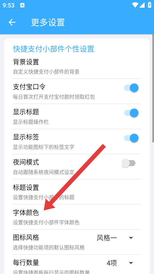 3、在快捷支付小部件個性設置界面,點擊字體顏色選項,進入顏色選擇頁面。