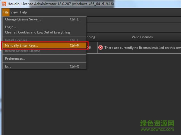 10、在Houdini License Administrator界面的菜單欄的File菜單下選Manual Enter Keys