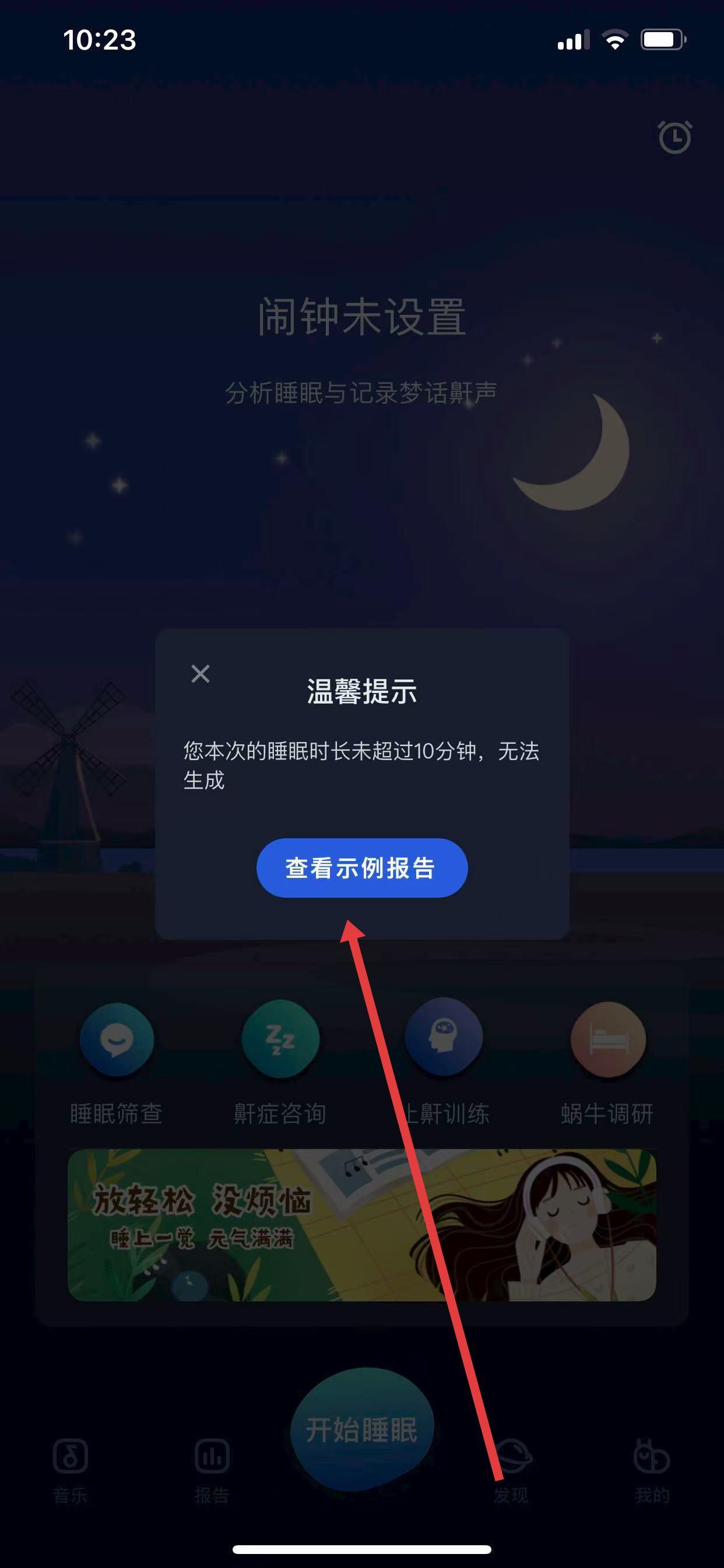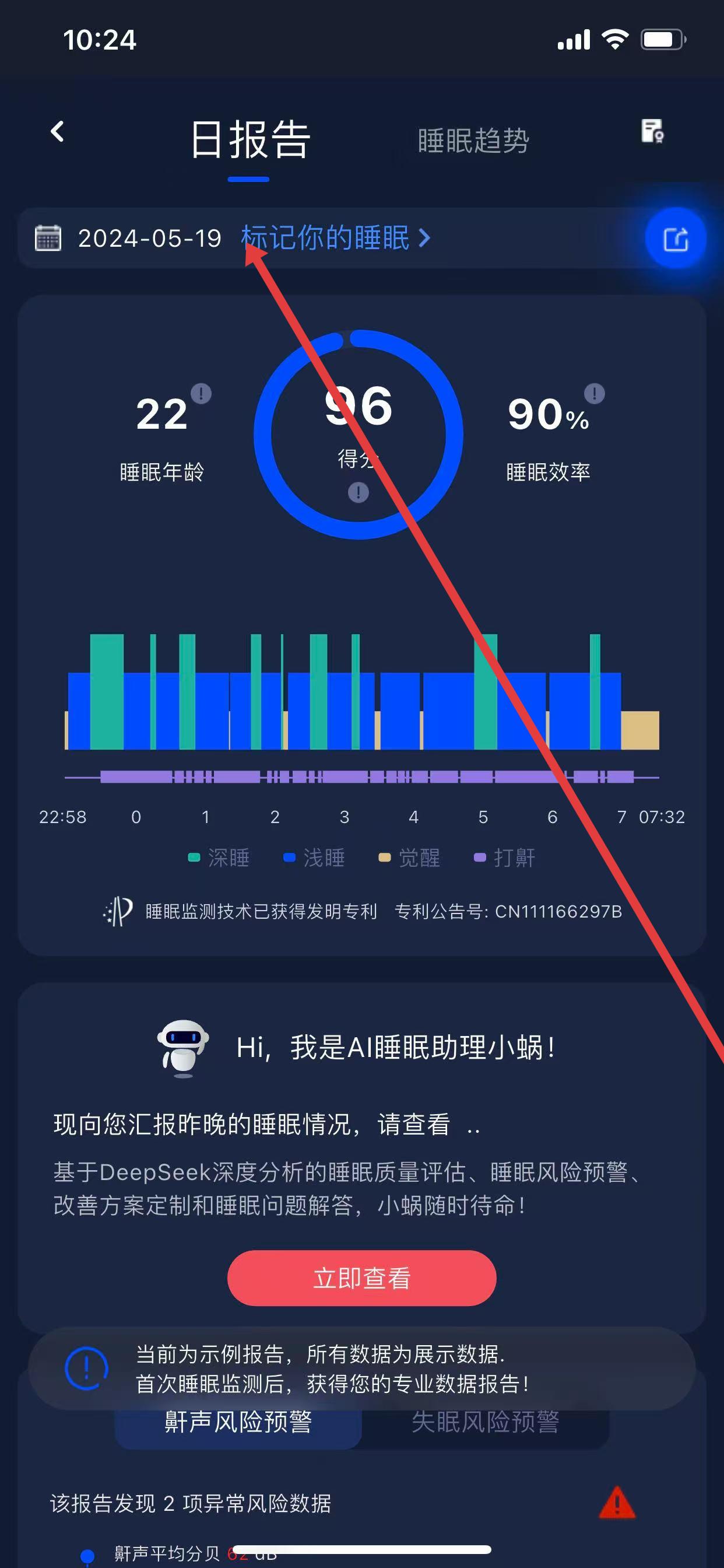 1、打開蝸牛睡眠APP,先確保完成有效睡眠監(jiān)測,再點擊底部導(dǎo)航欄的「報告」模塊,進入睡眠報告頁面。