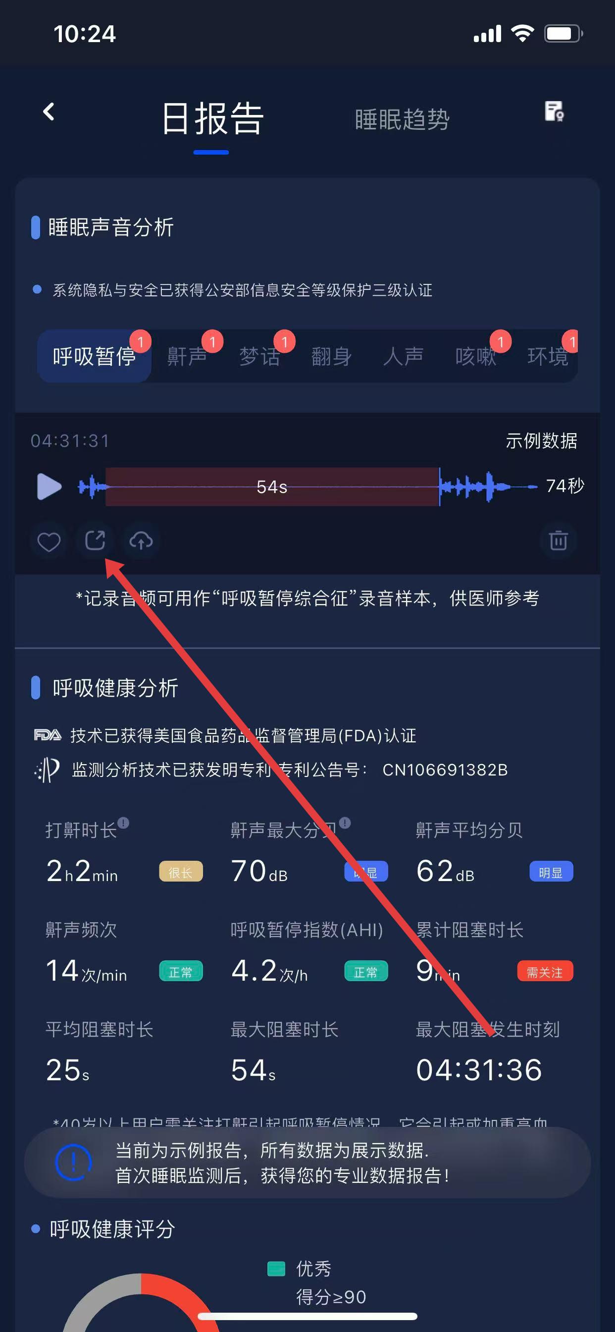 3、在睡眠聲音分析中,點擊錄音條目的播放按鈕,如呼吸暫停、鼾聲對應(yīng)的音頻,即可收聽睡眠過程中的錄音。
