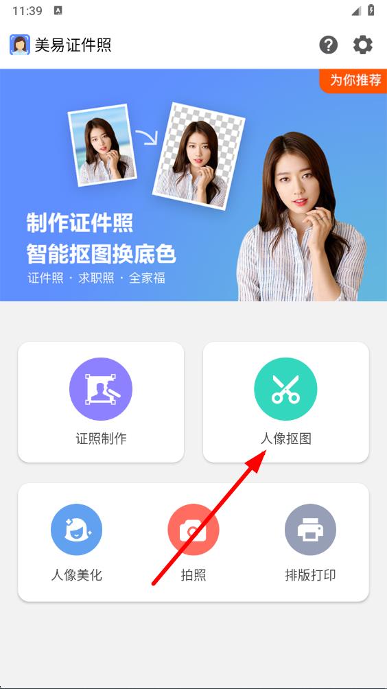 1、打開美易證件照app,在主界面點擊人像摳圖選項,進入圖片選擇界面。