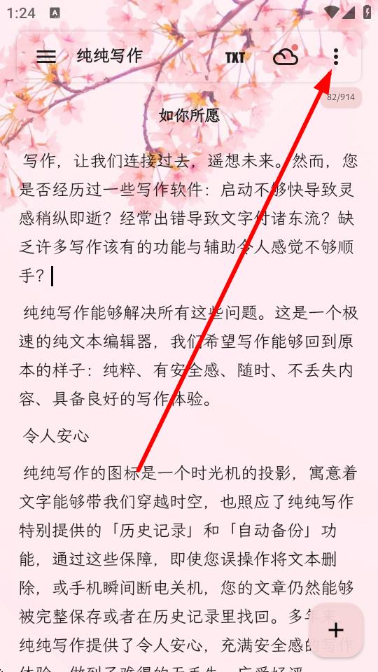 1、打開純純寫作App進(jìn)入寫作界面,點(diǎn)擊右上角三點(diǎn)豎向排列的圖標(biāo)。