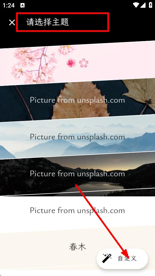 4、若預(yù)設(shè)主題無法滿足需求,還能點(diǎn)擊請(qǐng)選擇主題界面右下角的自定義按鈕,根據(jù)喜好自定義背景圖片,打造專屬寫作背景。