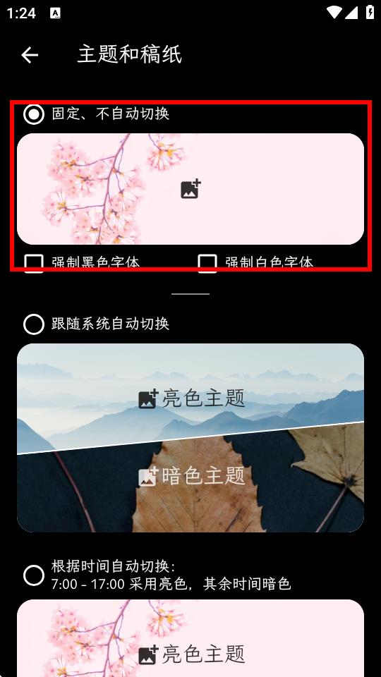 3、進(jìn)入主題和稿紙?jiān)O(shè)置界面后,在相應(yīng)模式下選擇預(yù)設(shè)的背景主題。