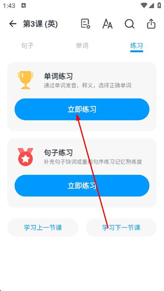 4、在單詞練習(xí)欄下點(diǎn)擊立即練習(xí),即可開始進(jìn)行單詞練習(xí)。