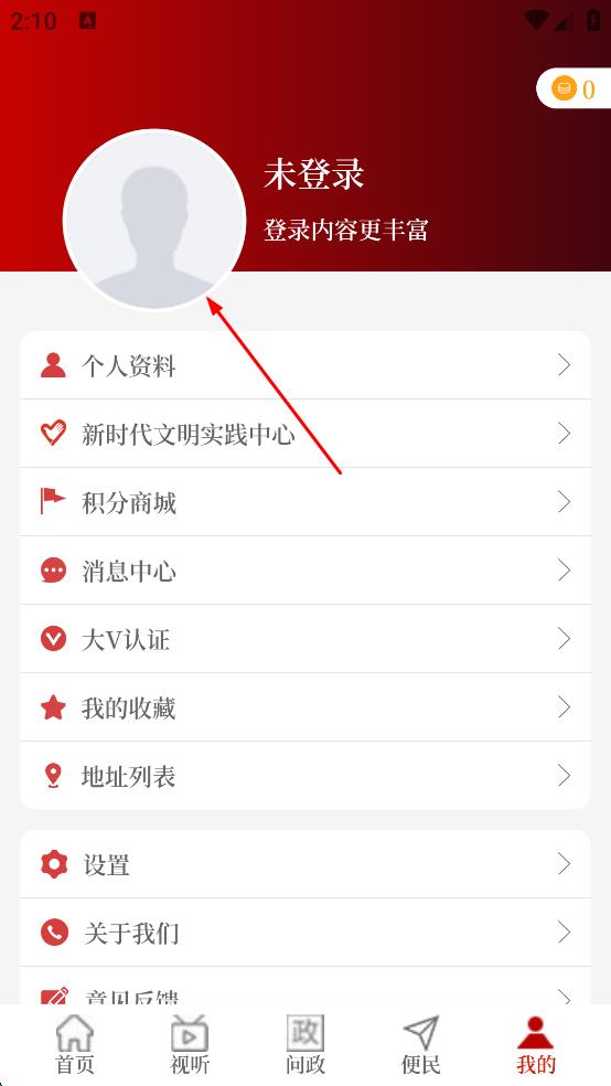 2、在“我的”頁面,點擊頭像區(qū)域,進入登錄頁面。