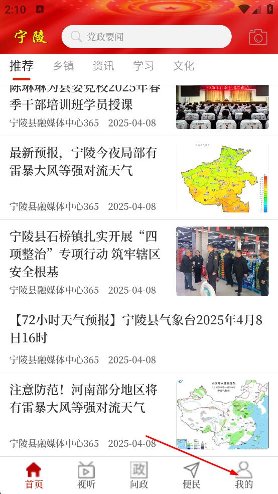1、打開寧陵融媒體APP,進入首頁后,點擊頁面右下角的“我的”按鈕。