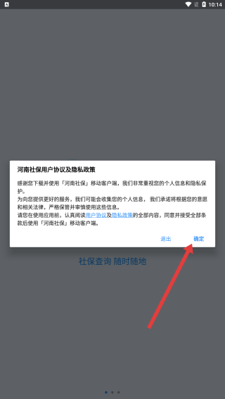 1、打開河南社保移動客戶端,閱讀用戶協(xié)議及隱私政策后,點(diǎn)擊確定按鈕,同意條款進(jìn)入應(yīng)用主界面。