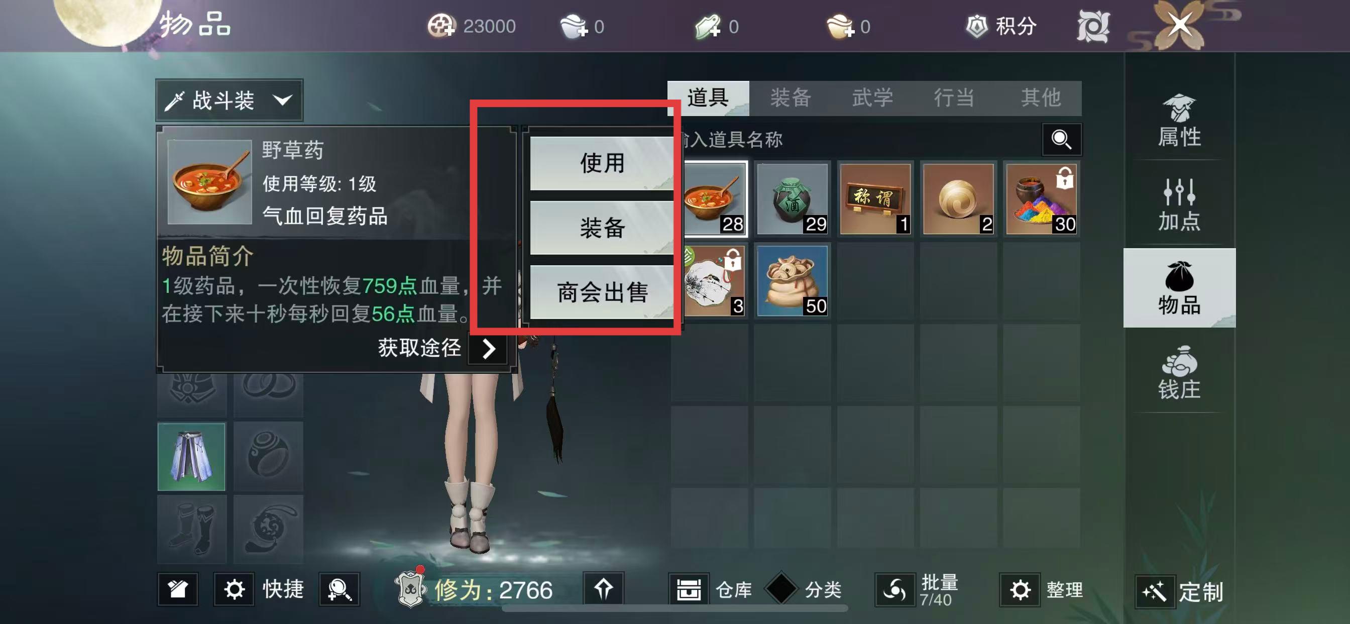 3、選擇使用、裝備、商會出售等操作,根據需求進行選擇即可。