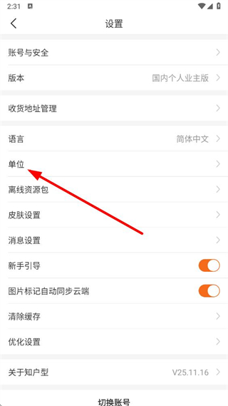 3、在設(shè)置頁面,點擊單位選項,進入測量單位與面積單位的選擇頁面。