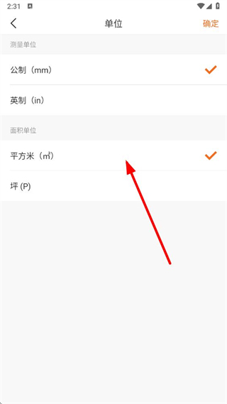 4、在單位頁面,選擇所需的測量單位、面積單位后,點擊右上角確定按鈕,完成單位信息修改。