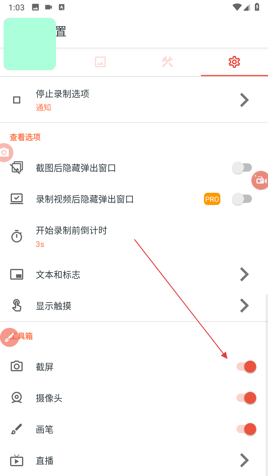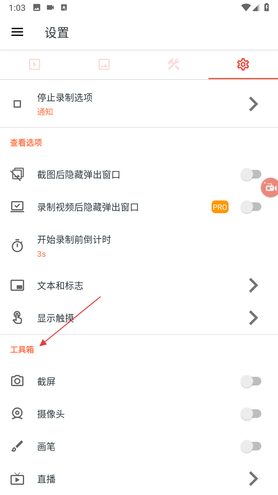 3、找到工具箱板塊,該板塊包含截屏、攝像頭、畫筆等工具選項。
