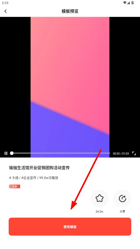 4、在模板預覽頁面,確認模板符合需求后,點擊下方使用模板按鈕,即可基于該模板開始創(chuàng)作。
