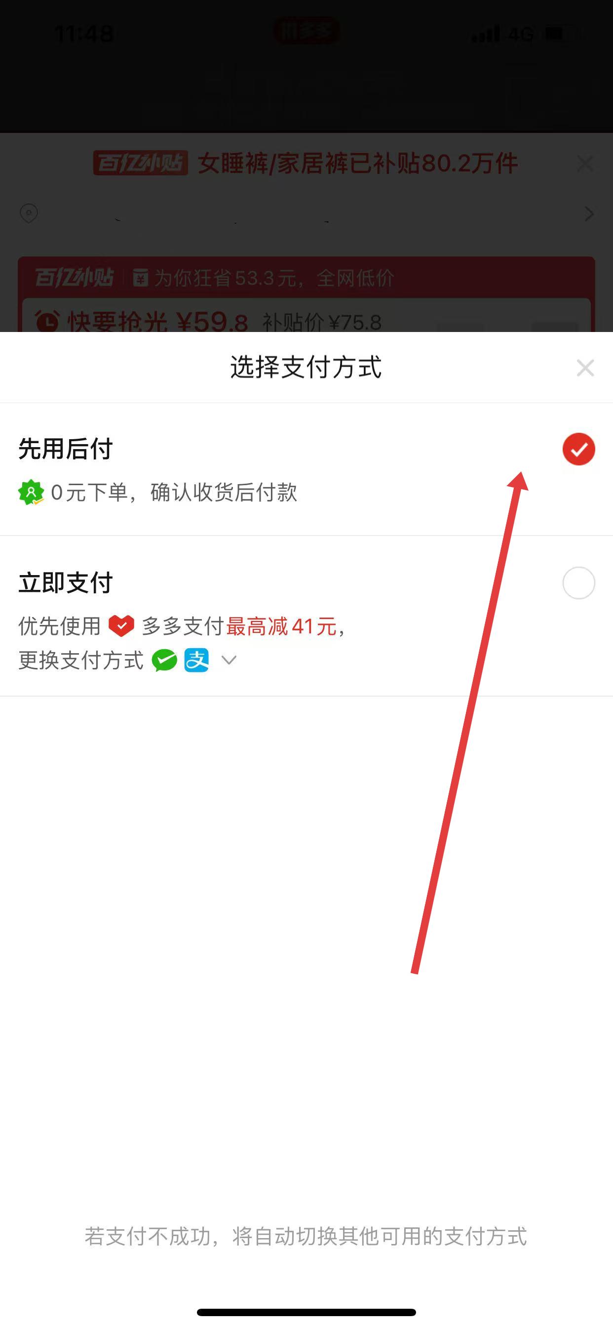 3、進(jìn)入選擇支付方式的界面,在該界面中可以看到先用后付選項,點擊勾選此選項,即可實現(xiàn)0元下單。