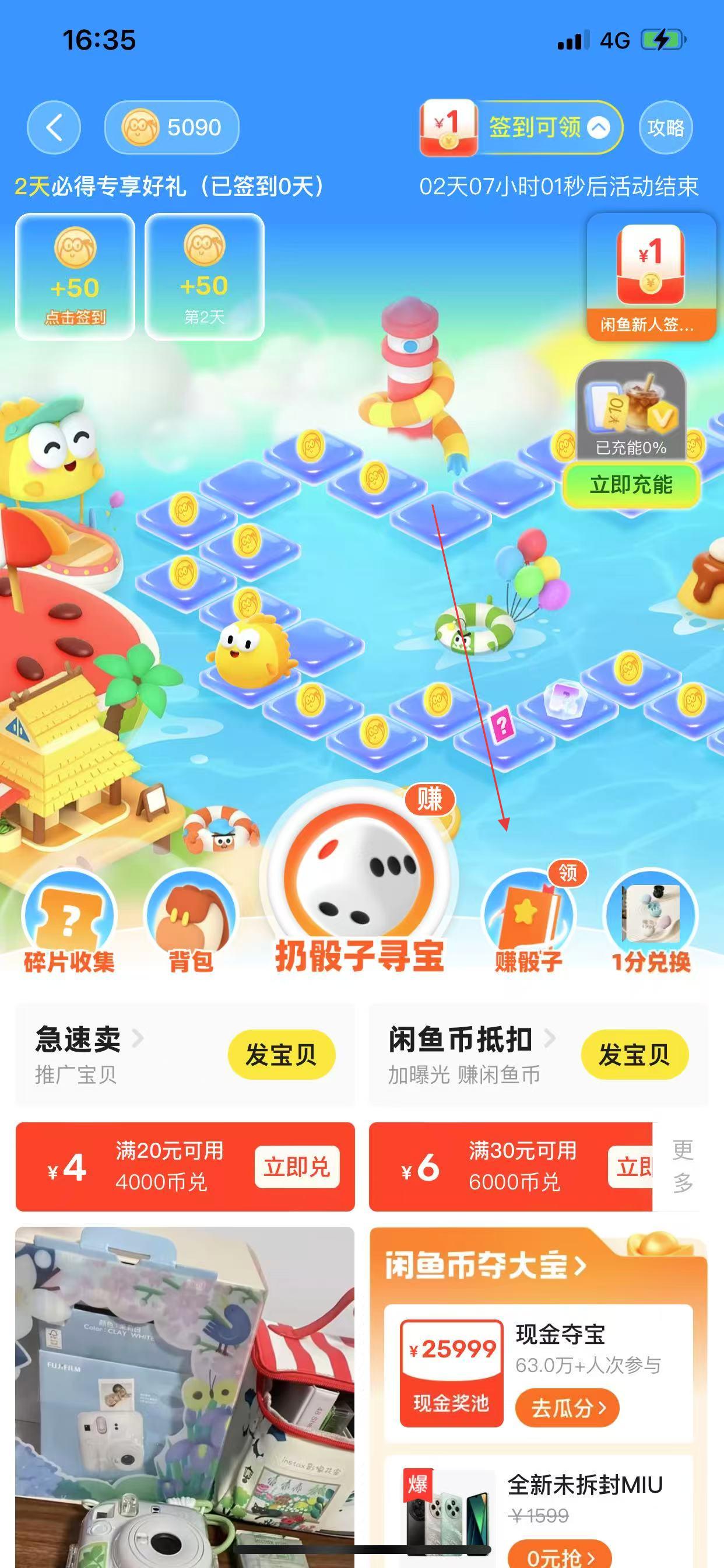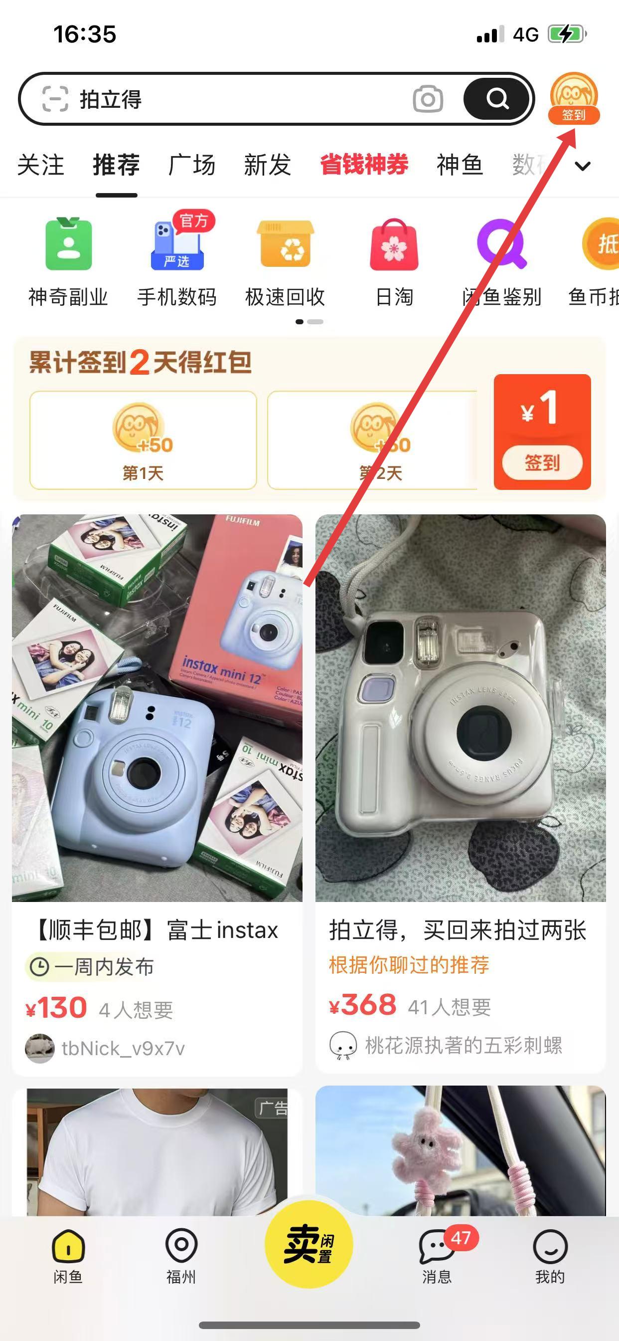 1、打開閑魚APP,點(diǎn)擊首頁(yè)右上角帶有簽到字樣的圖標(biāo),進(jìn)入閑魚幣活動(dòng)頁(yè)面。