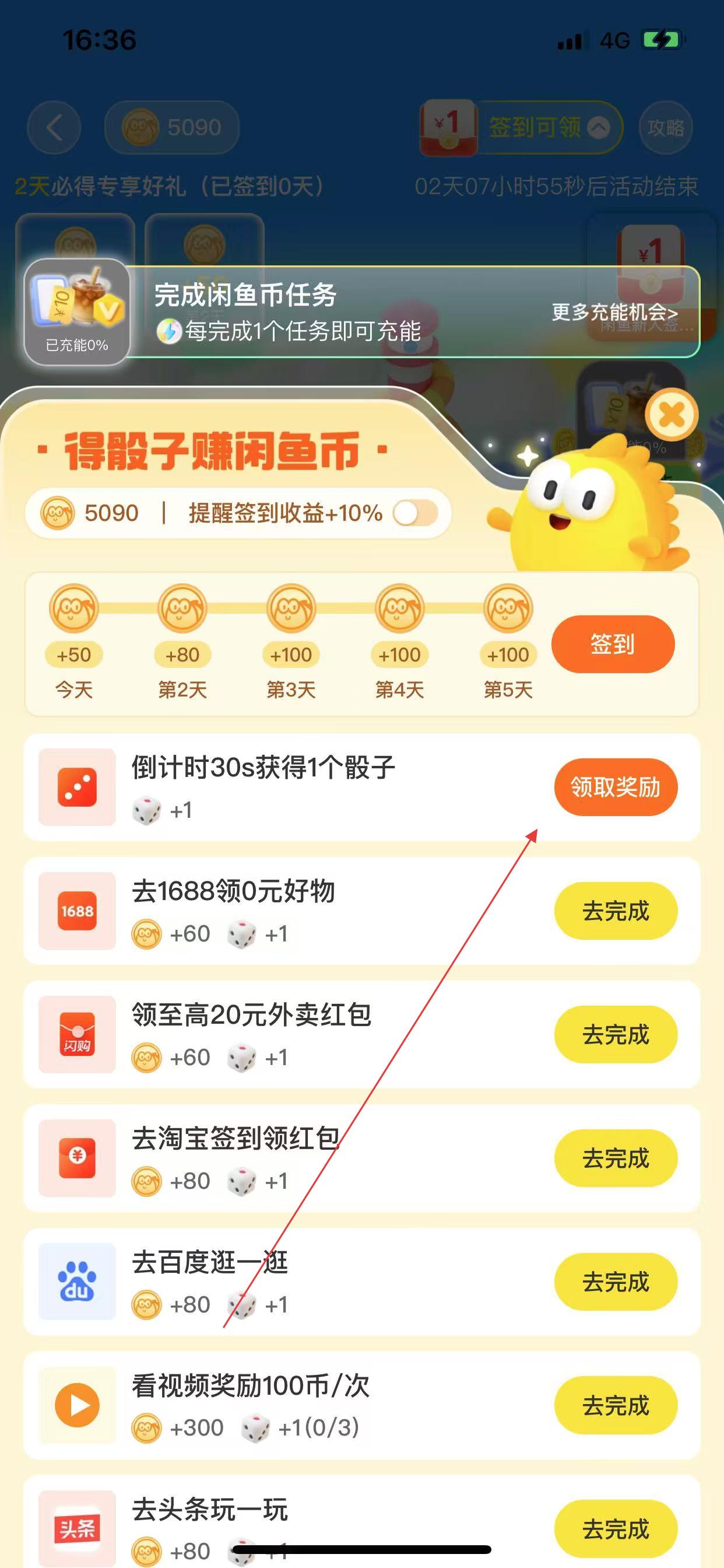 3、完成界面中的各種任務(wù)來(lái)獲取閑魚幣。