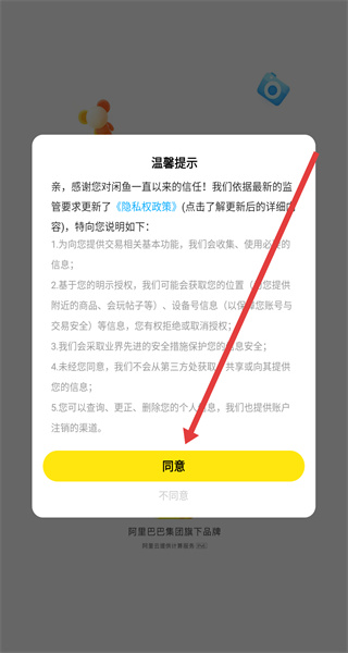 1、在打開閑魚App后,可以點(diǎn)擊彈窗中的同意按鈕,進(jìn)入閑魚主頁(yè)。