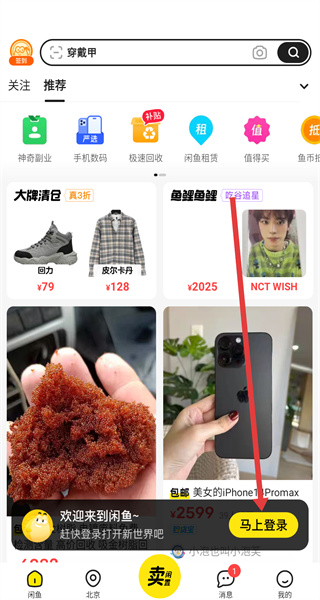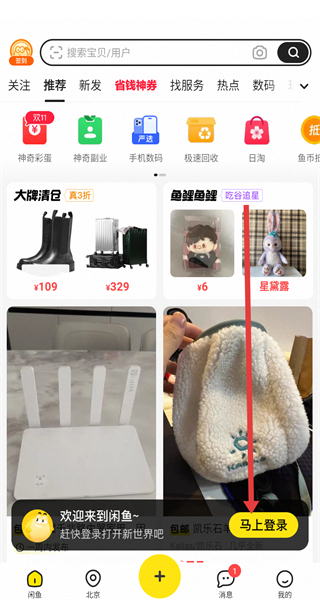 2、在進(jìn)入到閑魚主頁(yè)后,可以點(diǎn)擊下方馬上登錄按鈕,進(jìn)行登錄操作。