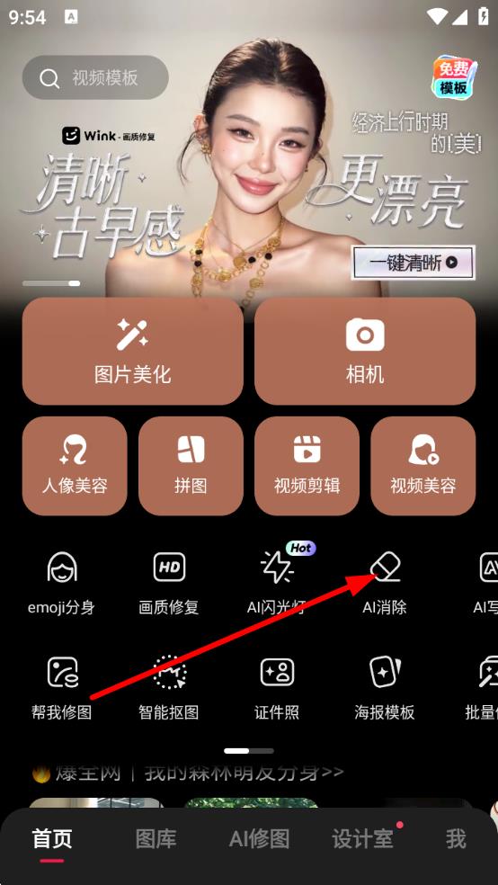 1、打開美圖秀秀,在首頁找到并點(diǎn)擊AI消除,進(jìn)入功能操作界面。
