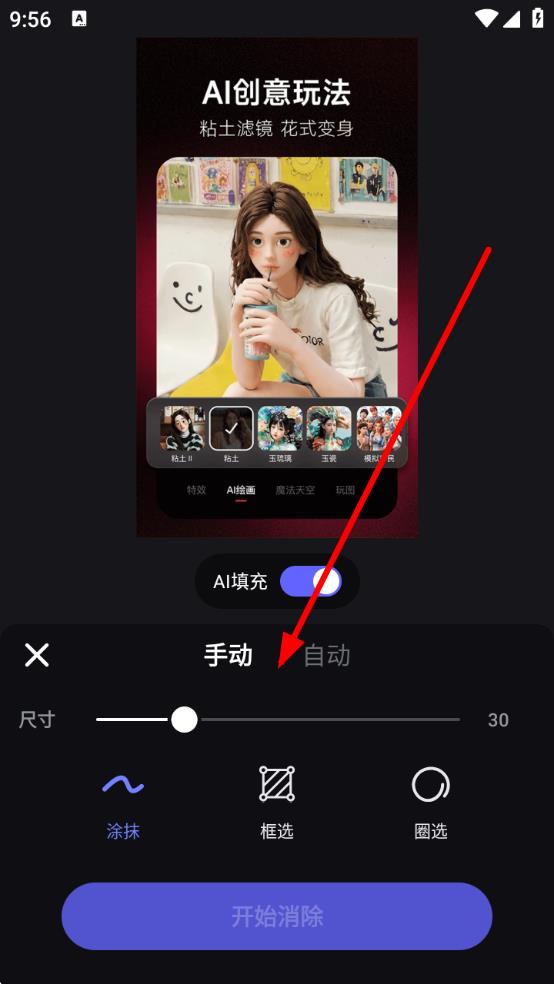 2、選擇手動模式,可通過涂抹、框選、圈選工具,精準(zhǔn)標(biāo)記需消除的畫面區(qū)域;切換自動模式,AI 會智能識別選區(qū),也可添加文字、水印等元素。