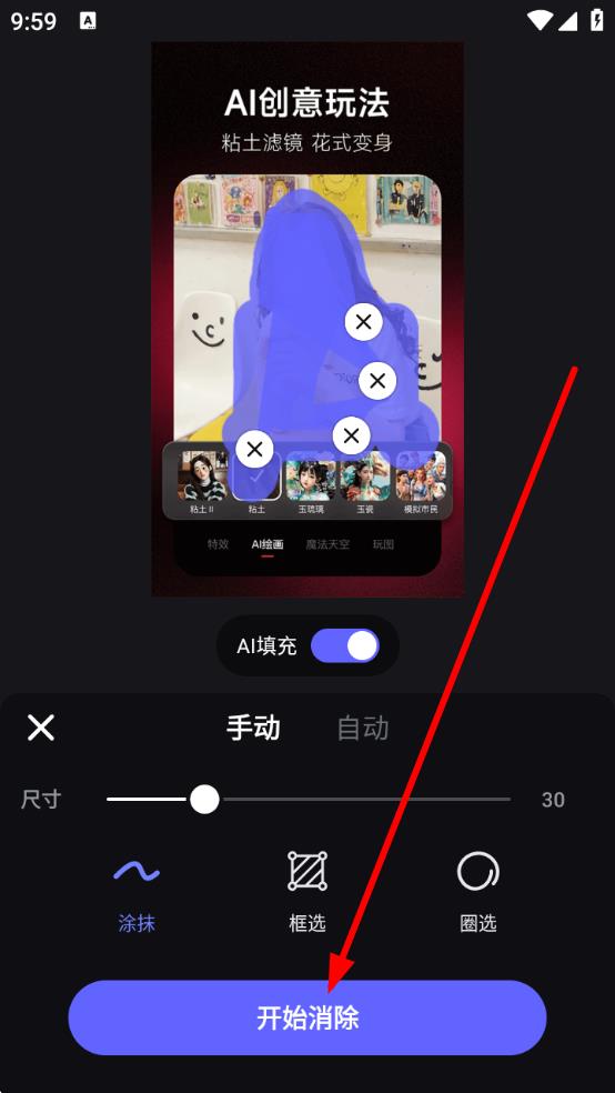 3、標(biāo)記完成后,點(diǎn)擊開始消除,AI 自動處理畫面,去除標(biāo)記內(nèi)容,實(shí)現(xiàn)畫面優(yōu)化,輕松打造干凈構(gòu)圖。