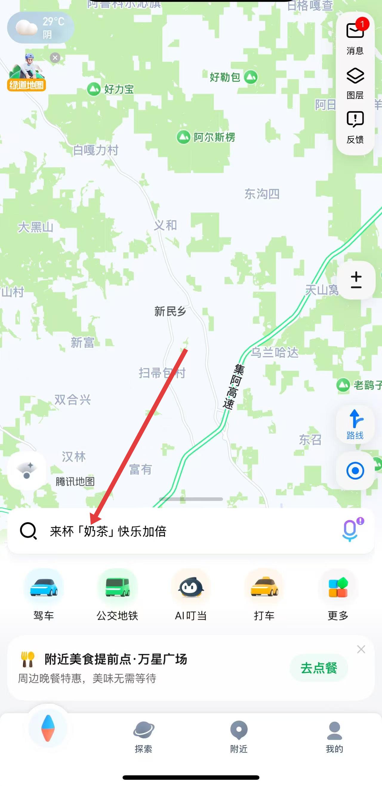 1、打開騰訊地圖APP,在主界面中找到搜索欄,點(diǎn)擊搜索欄輸入想要查找的地點(diǎn)。