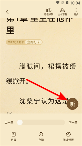 2、在小說(shuō)閱讀界面,點(diǎn)擊聽按鈕,進(jìn)入聽書界面。
