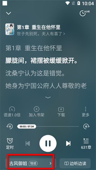 3、在聽書界面,點(diǎn)擊古風(fēng)御姐選項(xiàng),彈出切換聲音列表。