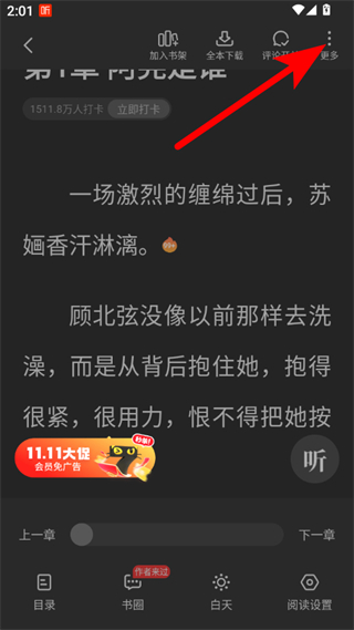 2、在小說(shuō)閱讀界面,點(diǎn)擊右上角更多選項(xiàng),展開功能列表。