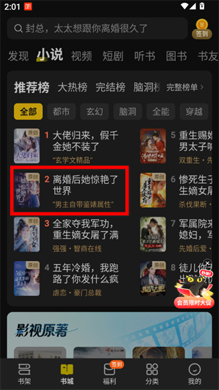 1、打開七貓小說(shuō)APP,進(jìn)入書城界面,在小說(shuō)分類下的各類榜單中,選擇想要下載的小說(shuō),比如婚后上癮,點(diǎn)擊進(jìn)入小說(shuō)詳情頁(yè)。