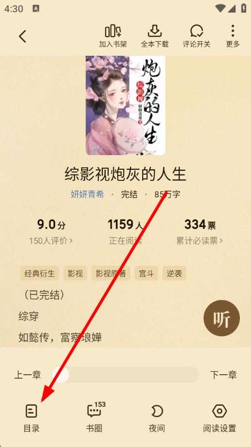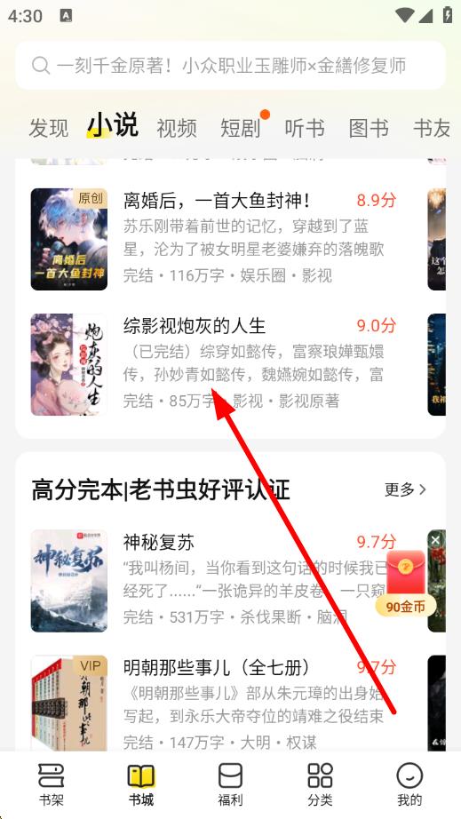 1、打開七貓小說APP,在書城或其他界面找到想閱讀的小說,比如綜影視炮灰的人生,點(diǎn)擊進(jìn)入小說閱讀界面。