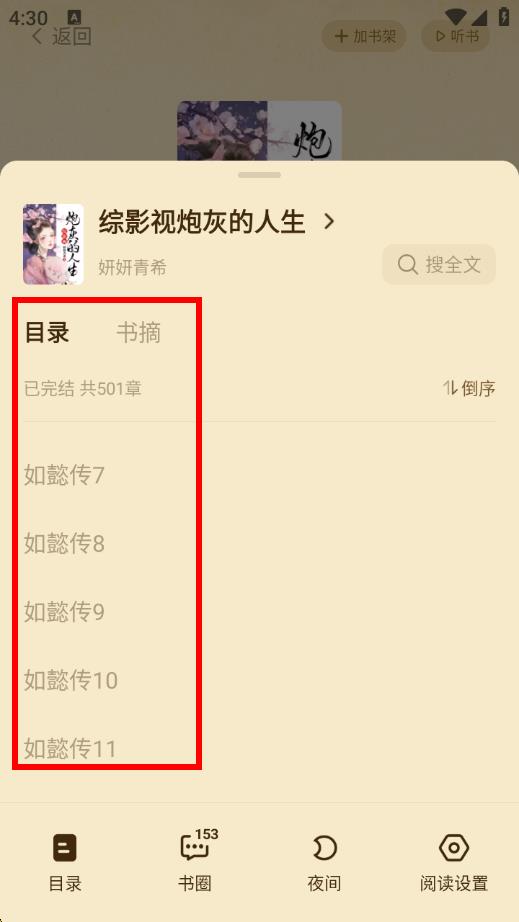 3、點(diǎn)擊后會(huì)彈出目錄頁(yè)面,在這里能看到小說已完結(jié)的章節(jié)總數(shù),以及具體的章節(jié)列表,方便快速定位和跳轉(zhuǎn)至想要閱讀的章節(jié)。