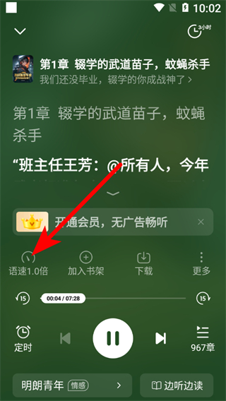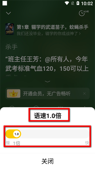 3、在小說收聽界面,點(diǎn)擊語(yǔ)速1.0倍選項(xiàng),彈出語(yǔ)速調(diào)節(jié)框。