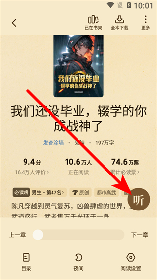 2、在小說詳情頁(yè)面,點(diǎn)擊聽按鈕,進(jìn)入小說收聽界面。