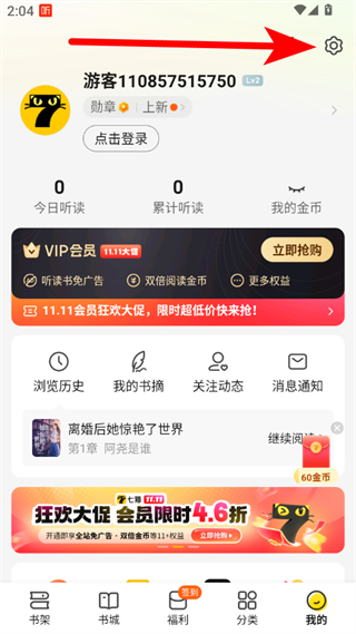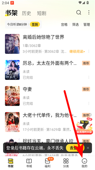1、在七貓小說書架頁(yè)面,點(diǎn)擊右下角我的選項(xiàng),進(jìn)入個(gè)人中心頁(yè)面。