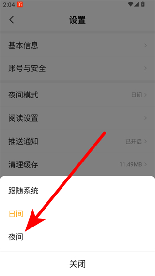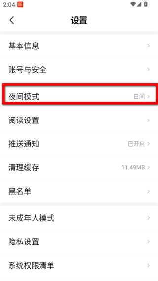 3、在設(shè)置頁(yè)面,點(diǎn)擊夜間模式選項(xiàng),彈出模式選擇菜單。