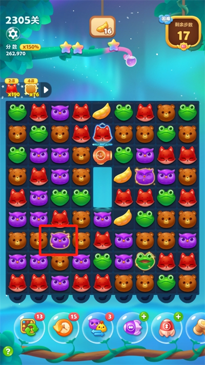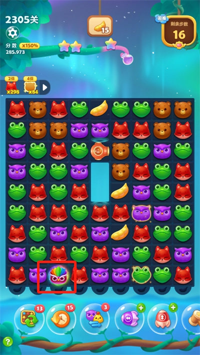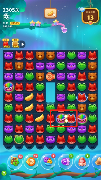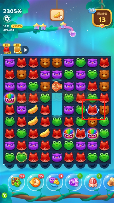 4、如果有任何具有爆炸或者消除的特殊動物與小鳥相互合成,將會與小鳥相碰的動物都帶上特效進(jìn)行炸彈消除。