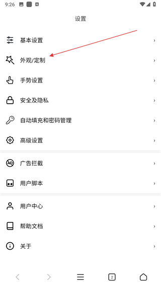 3、在設置頁面點擊外觀/定制選項,進入外觀/定制頁面。