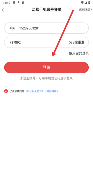 4、在進(jìn)入到手機(jī)賬號登錄頁面中,填寫完輸入框?qū)?yīng)信息后,點(diǎn)擊登錄按鈕即可完成登錄賬號。