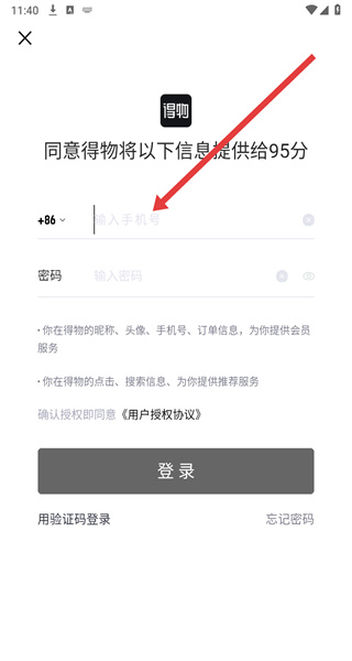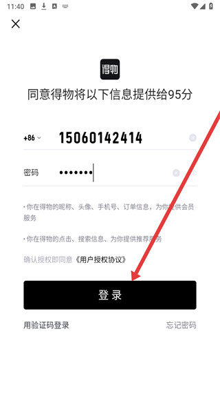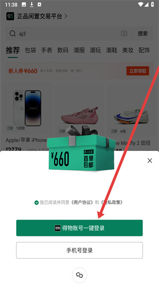 2、在進(jìn)入到app中,可以點(diǎn)擊登錄彈窗中的得物賬號一鍵登錄按鈕,進(jìn)行登錄操作。