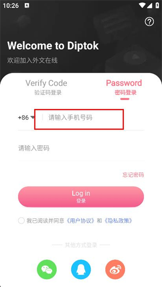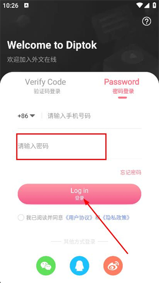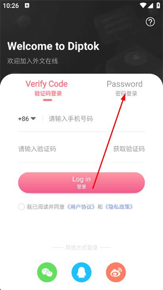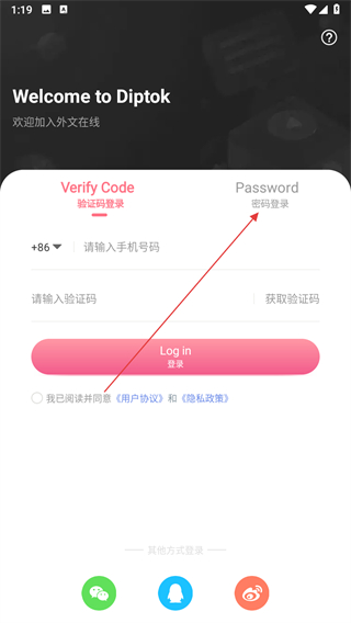 1、打開外文在線APP,在登錄頁面點擊密碼登錄。