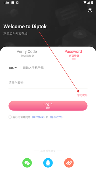 2、點擊忘記密碼選項,進(jìn)入隱私政策頁面。
