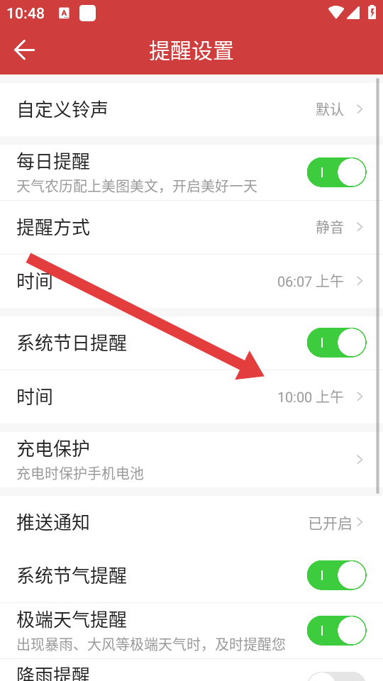 3、在提醒設(shè)置頁面里,找到系統(tǒng)節(jié)日提醒板塊下的時間選項,點擊后選擇具體時間,即可設(shè)置節(jié)日提醒時間。