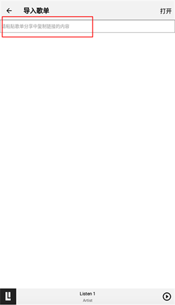 3.提前在歌單分享功能中復(fù)制好歌單鏈接,最后在【導(dǎo)入歌單】頁面中,粘貼到框框中,點(diǎn)擊右上角的“打開”即可導(dǎo)入成功。